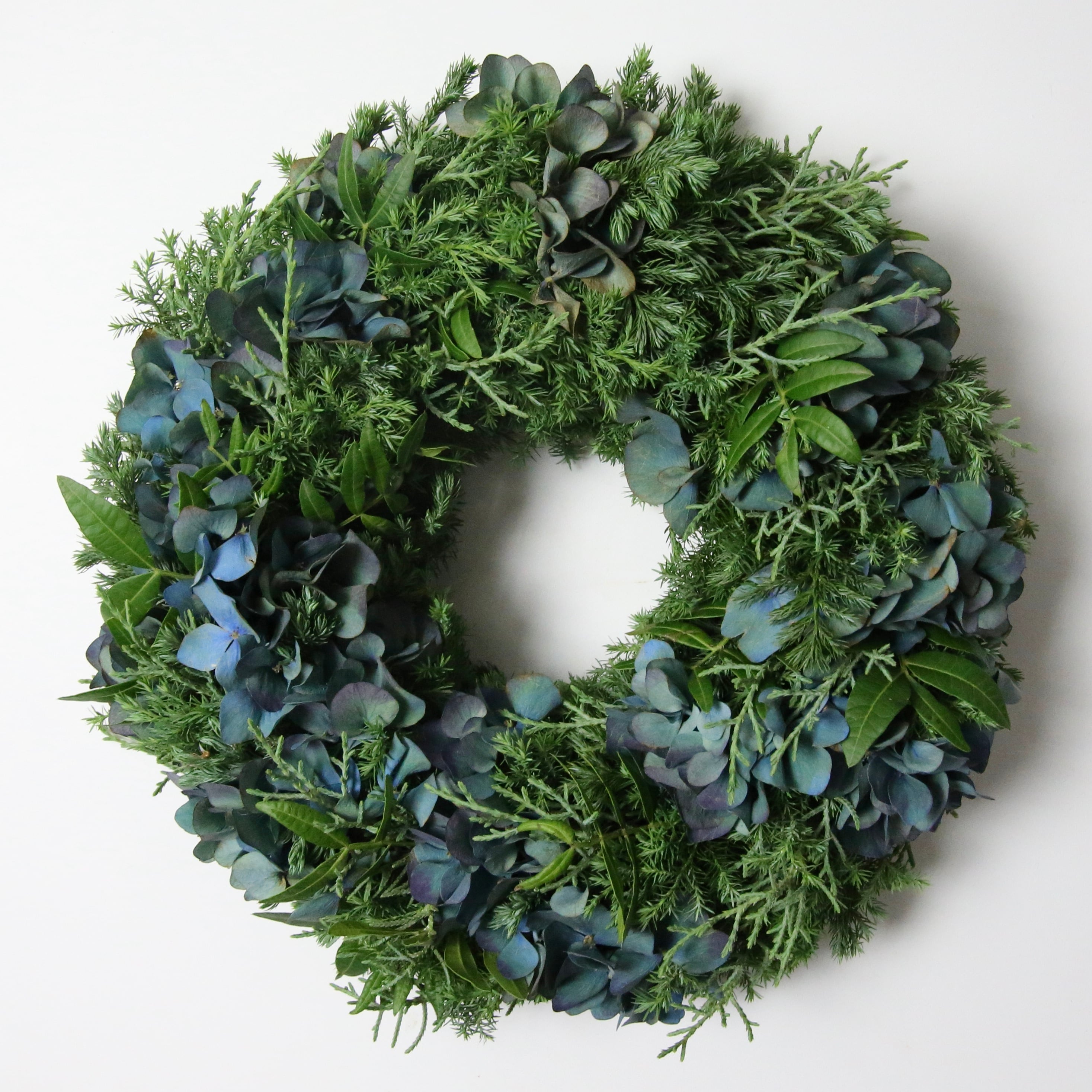 アジサイ「ピンパーネルクラシック」や、針葉樹などで作ったリース