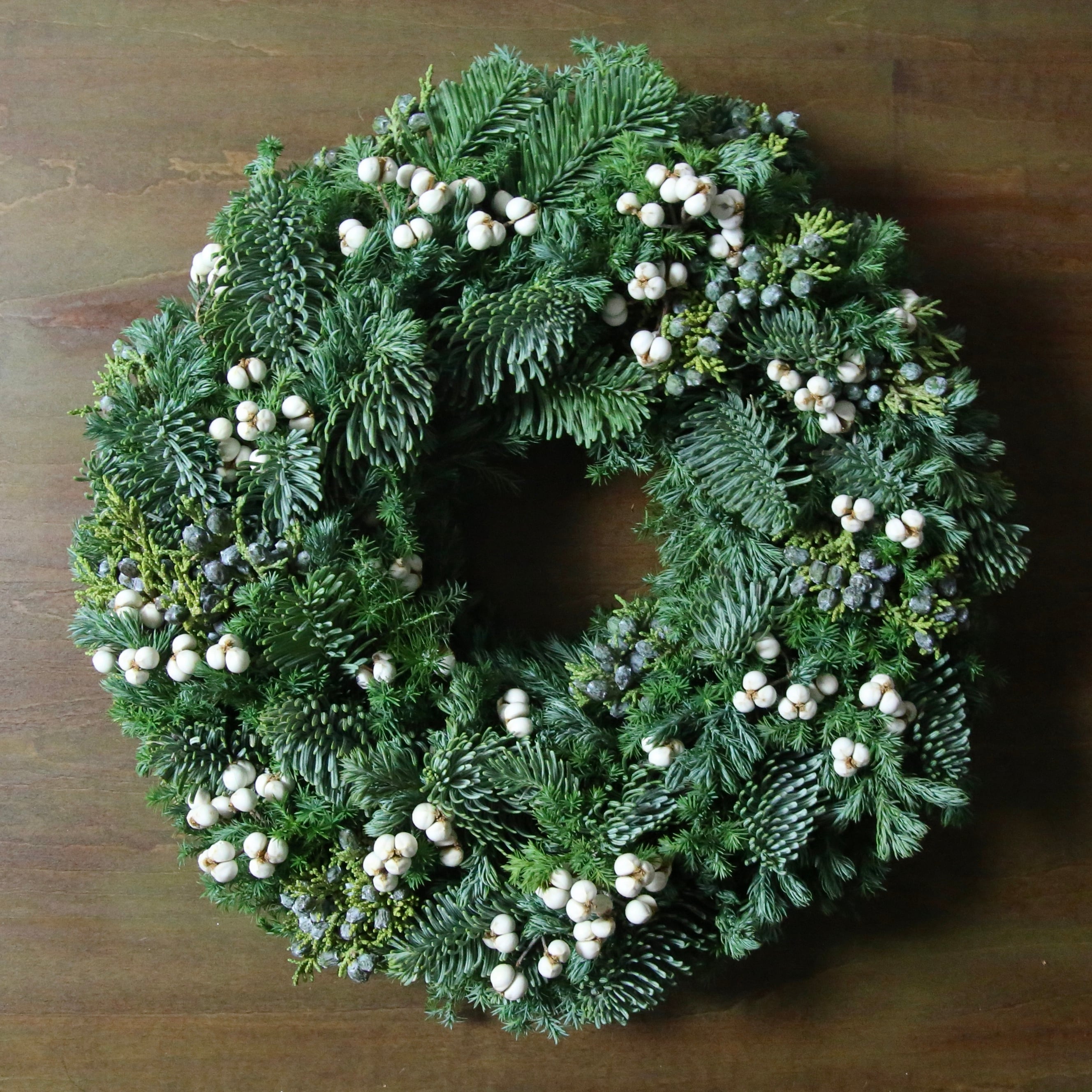 フレッシュのオレゴン産モミとネズに、ヒムロスギ、ブルーバードの針葉樹とナンキンハゼで作ったリースです。