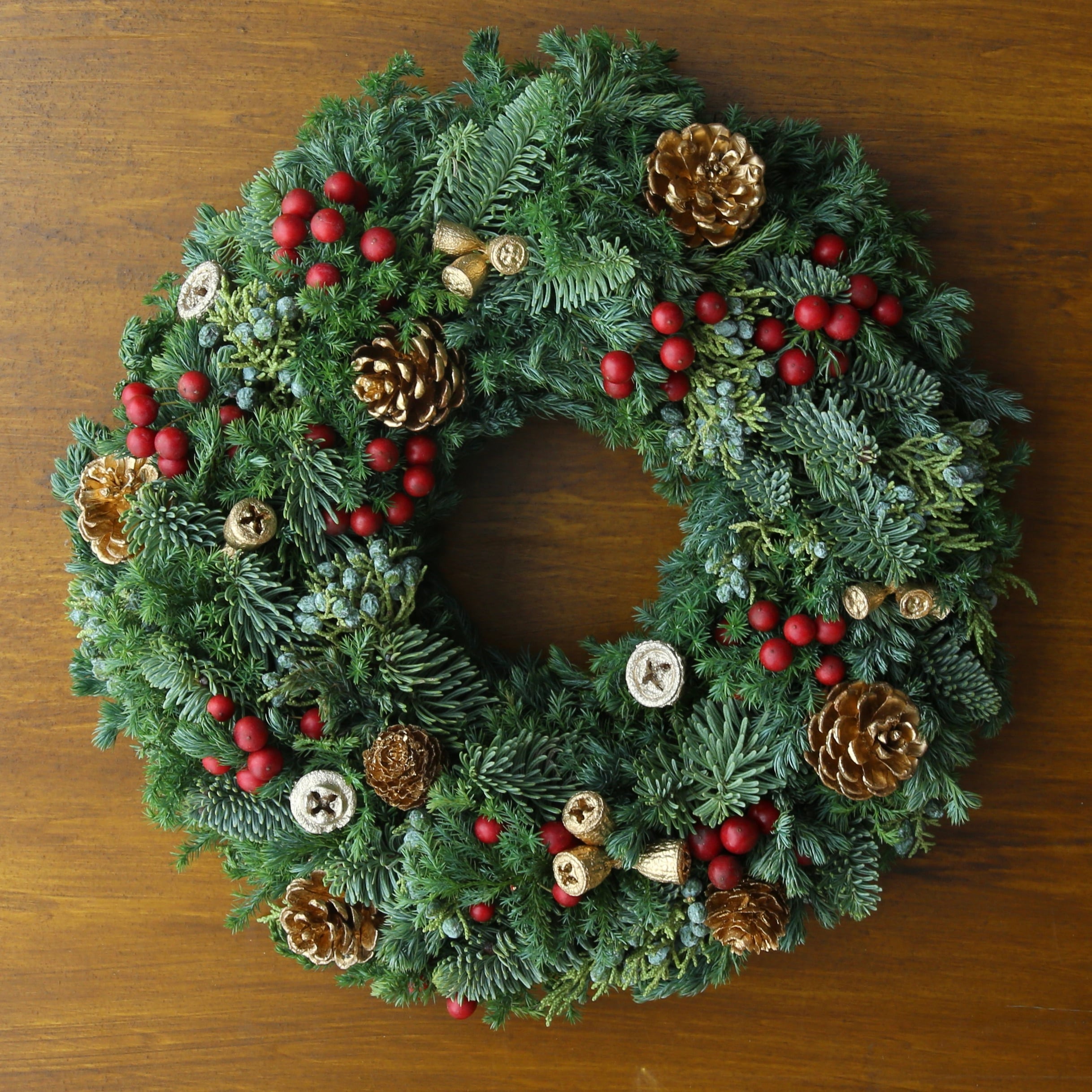 フレッシュのオレゴン産モミやネズと、針葉樹をサンキライ、マツカサで飾ったリース