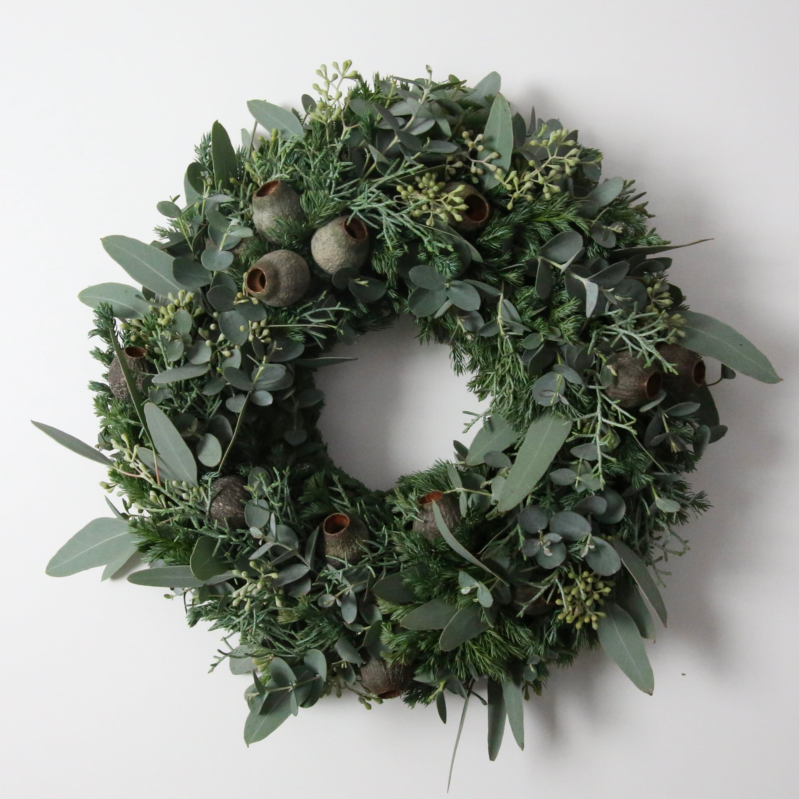 フレッシュのユーカリ2種類とユーカリの実、針葉樹で作ったリースです。