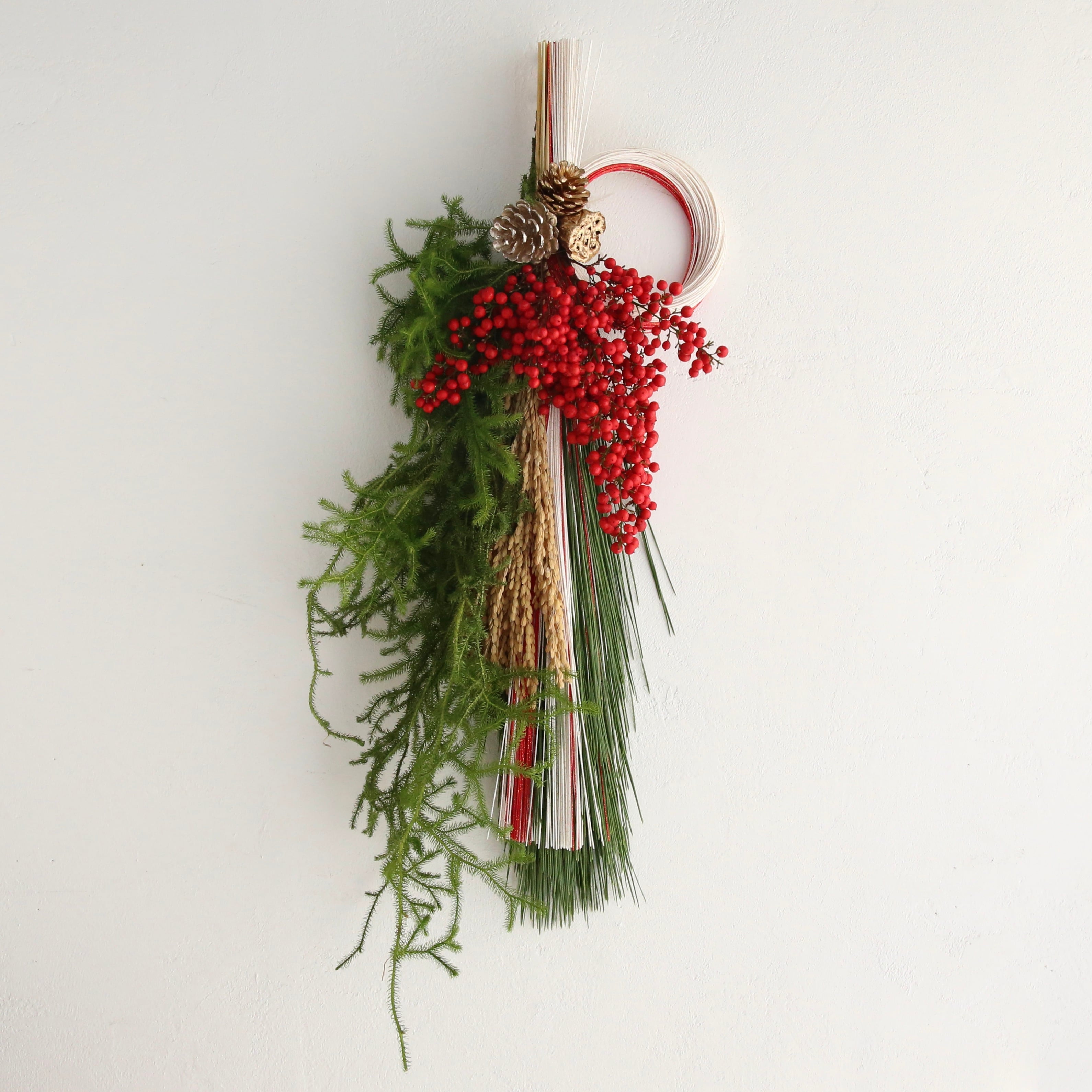 大王松やヒカゲカズラ、南天、稲穂、水引等で作ったお正月飾り