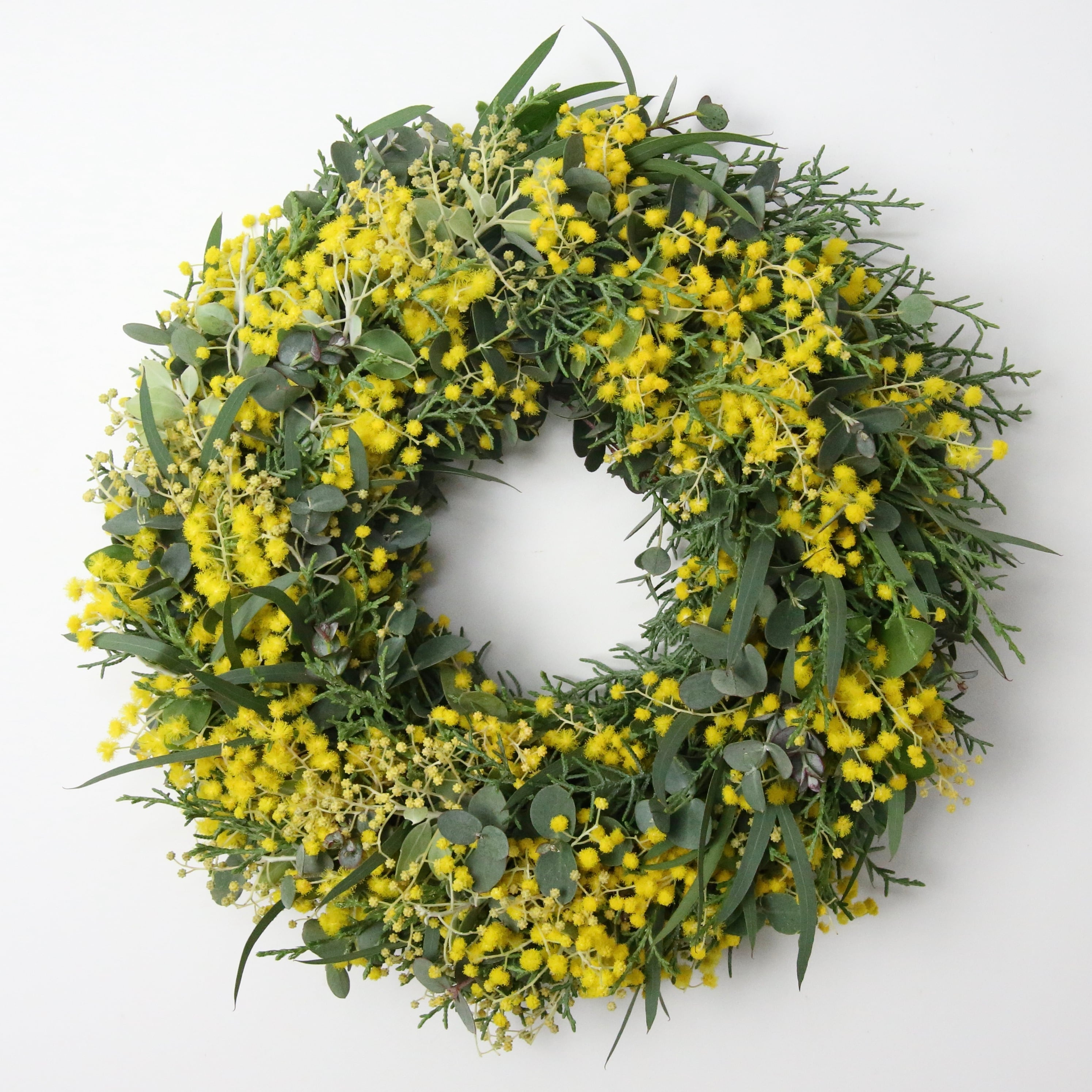ミモザやユーカリを贅沢に使って作ったリースです。