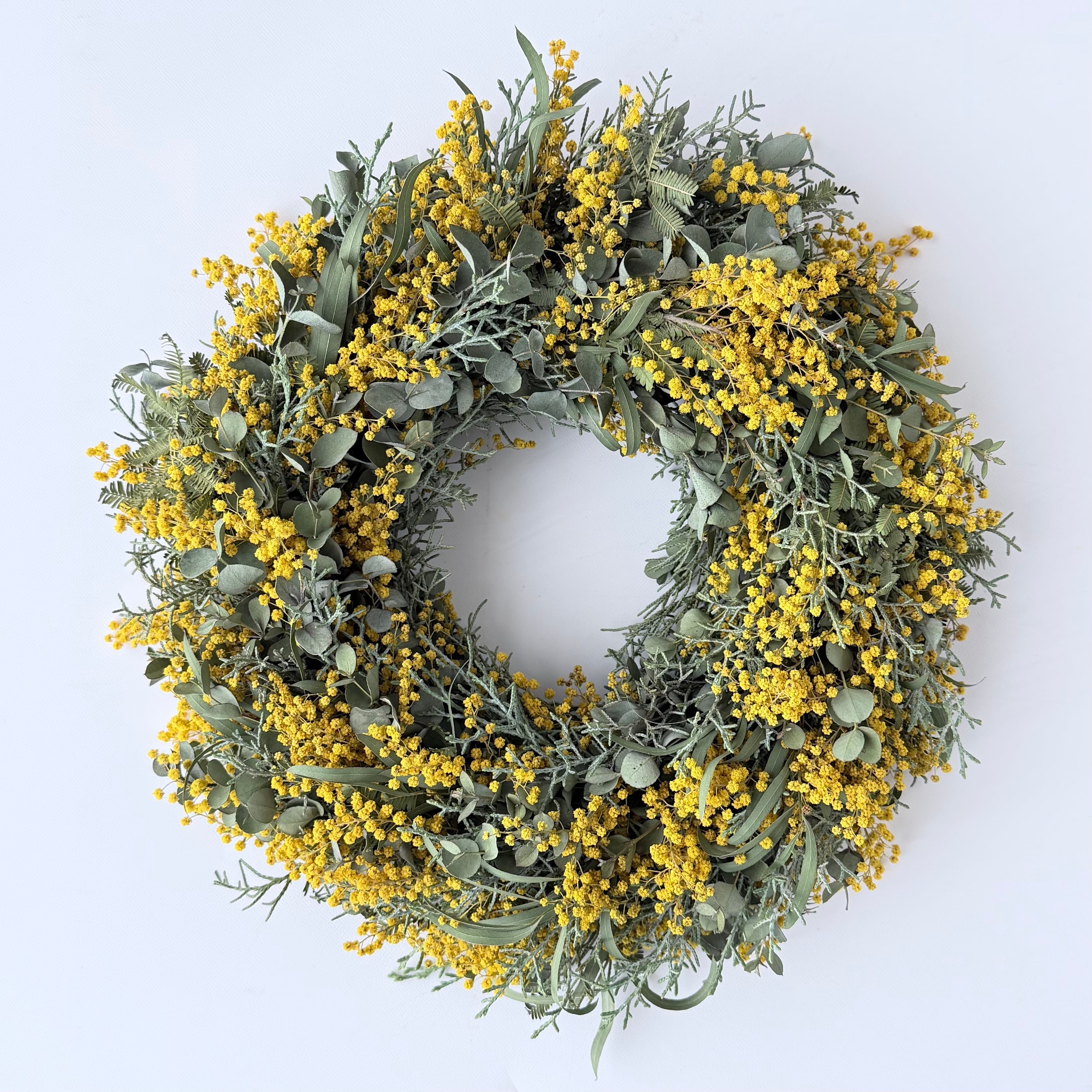 ミモザやユーカリ、針葉樹などで作ったドライフラワーのリースです。