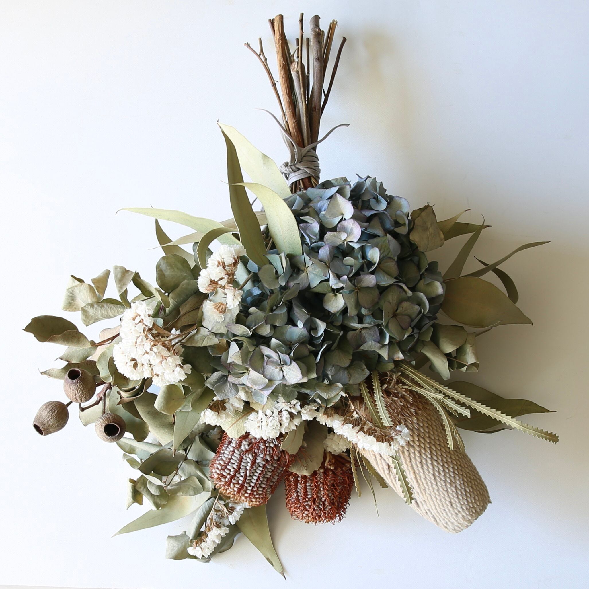 バンクシャーやアジサイ、ユーカリのドライフラワーのブーケ