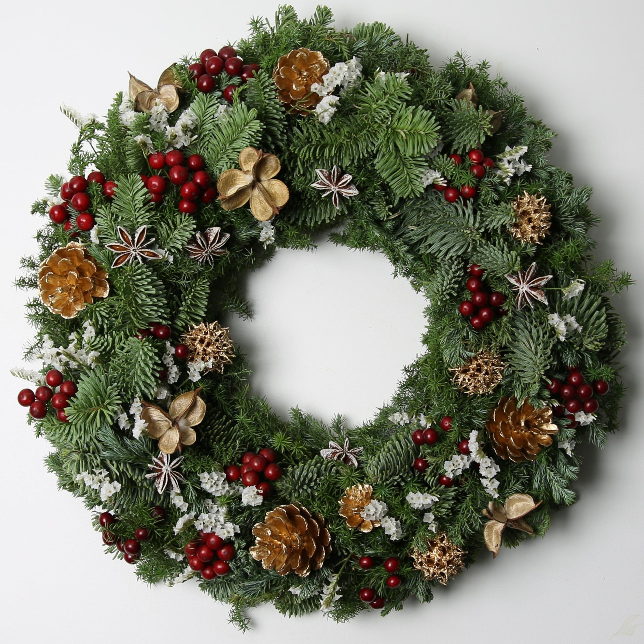 フレッシュのオレゴン産モミと、ブルーバード、ヒムロスギの針葉樹をマツカサやサンキライで飾ったリース(L)