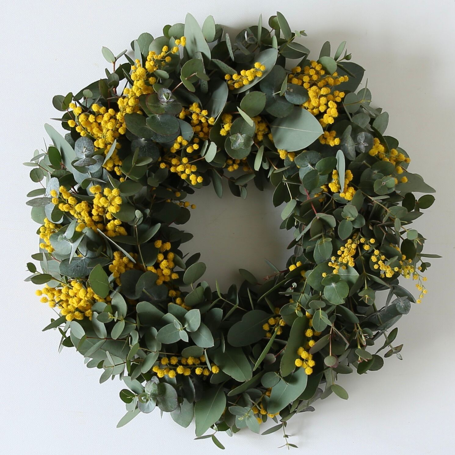 ミモザ「ミランドール」とユーカリ4種類で作ったリースです。