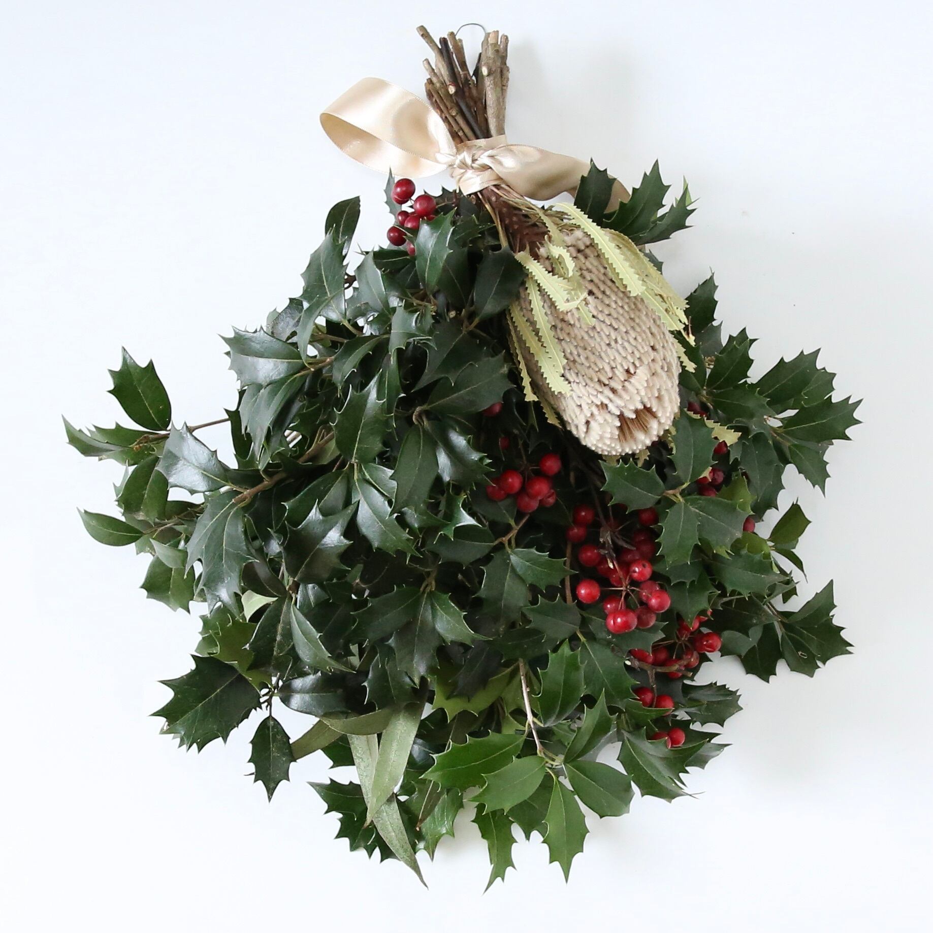 ヒイラギとサンキライ、バンクシアを束ねたスワッグです。