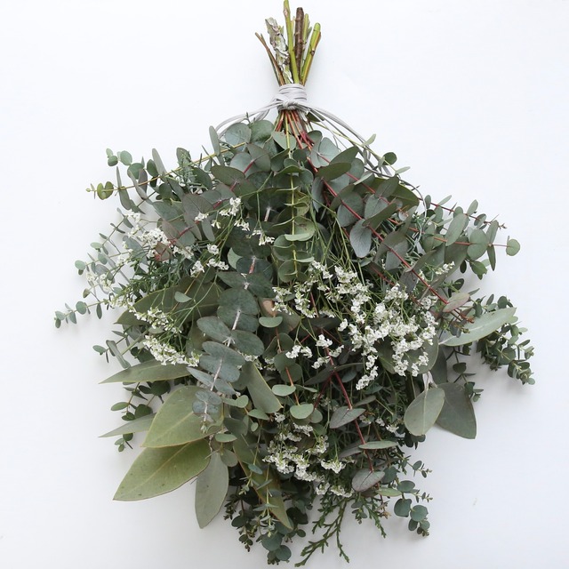ユーカリ4種類と針葉樹、リモニュームを束ねたスワッグ