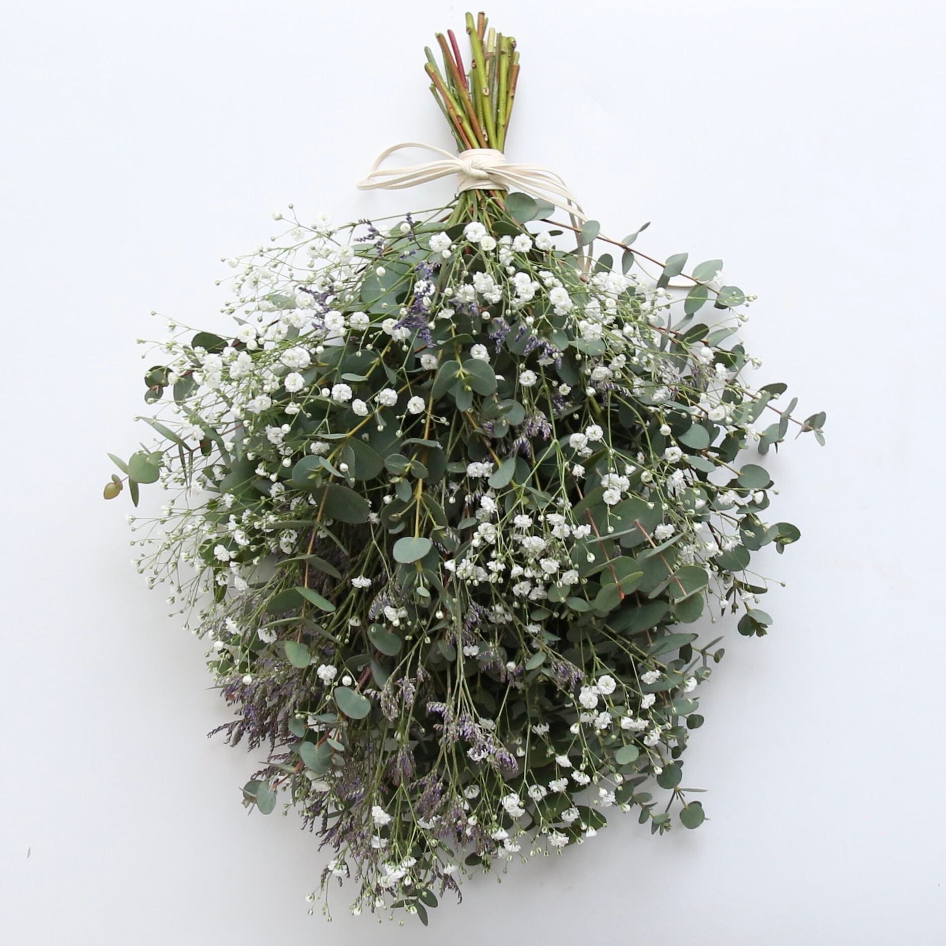 ユーカリ2種類とかすみ草、リモニュームを束ねたスワッグ