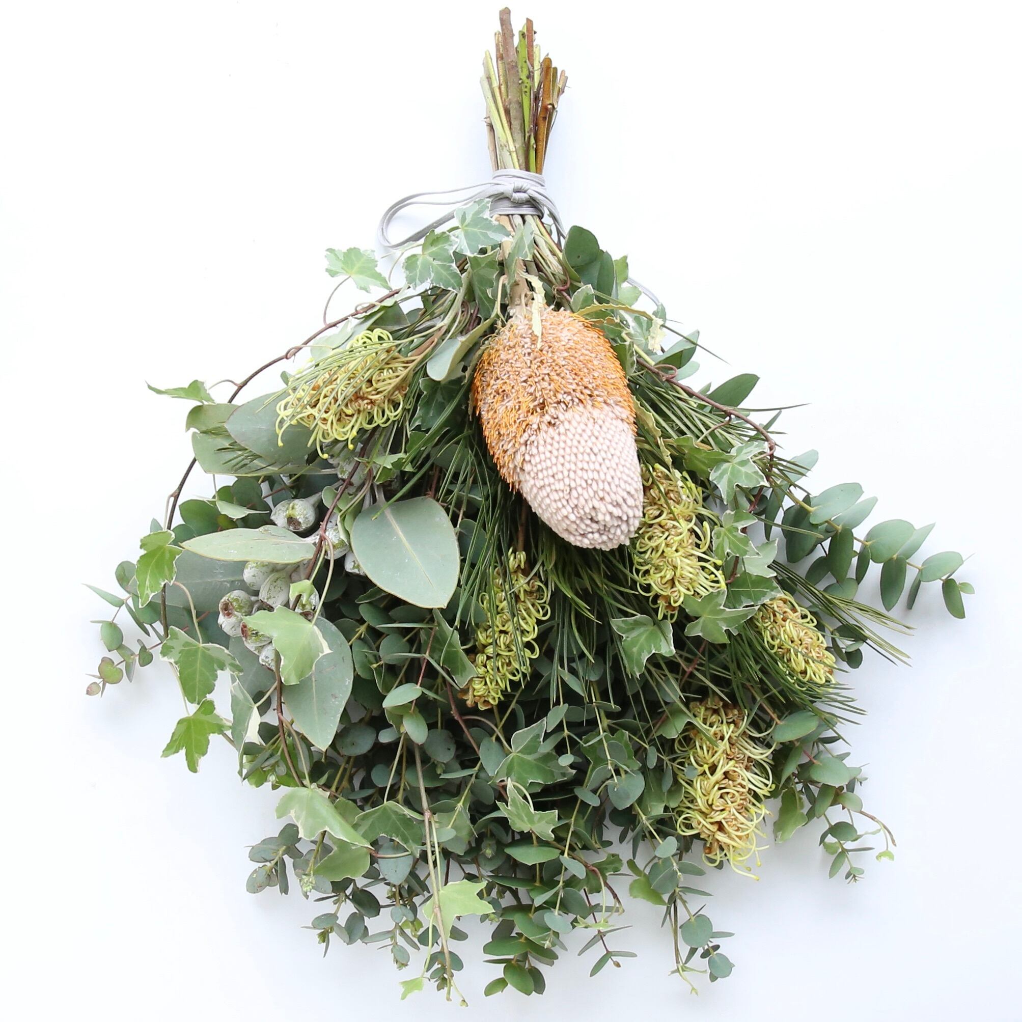 ユーカリやアイビーとバンクシャーなどのワイルドフラワーを束ねたスワッグです。